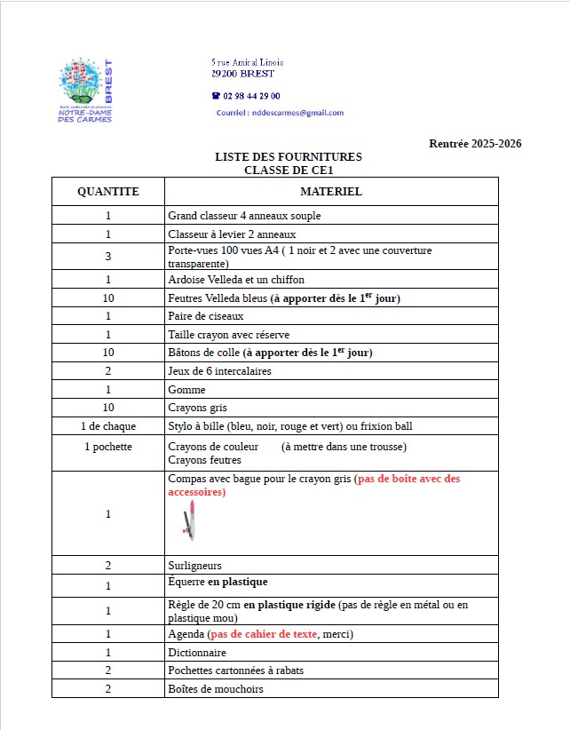 Fournitures pour les élèves de la classe de CE1