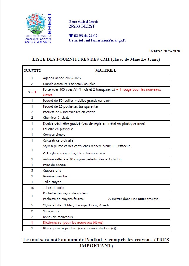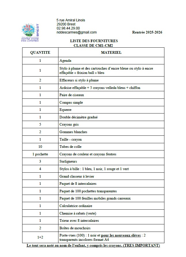 Fournitures pour les élèves de la classe de CM1-CM2