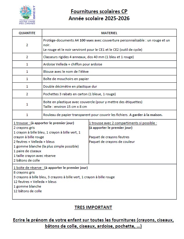Fournitures pour les élèves de la classe de CP