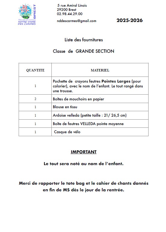 Fournitures pour les élèves de GS