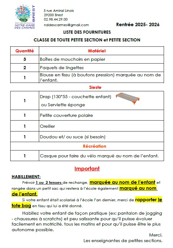 Fournitures pour les élèves de MS